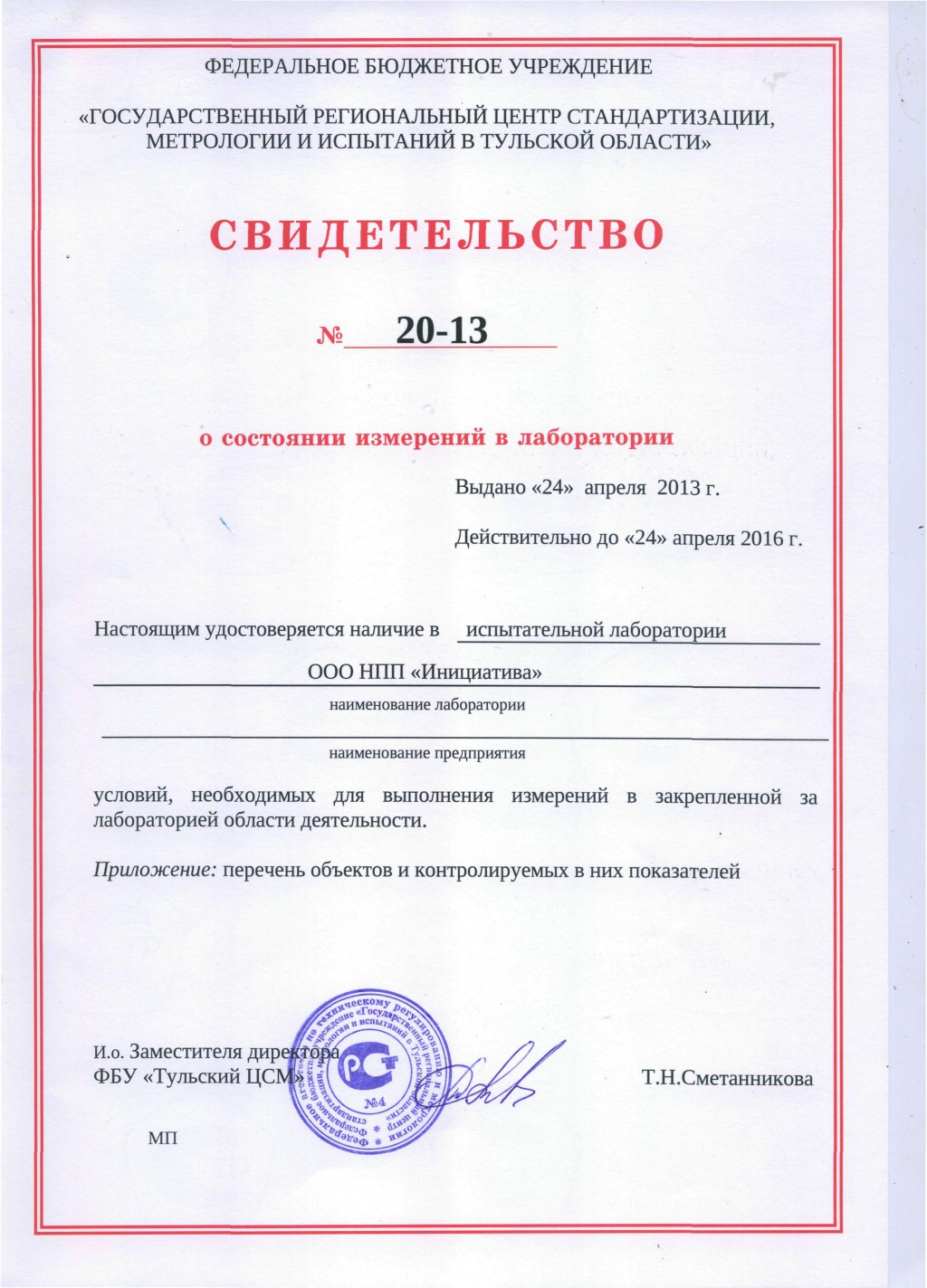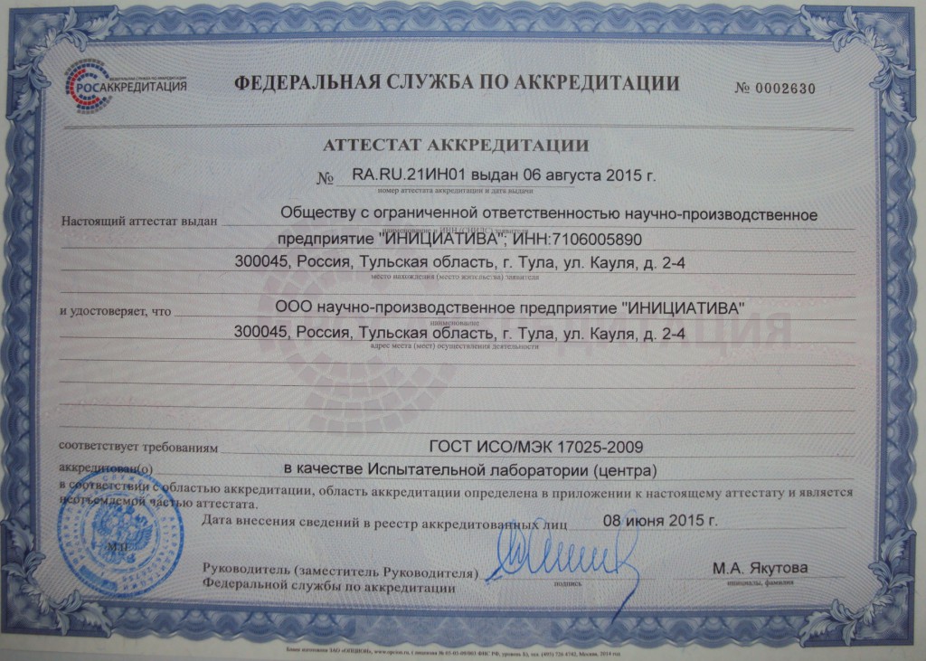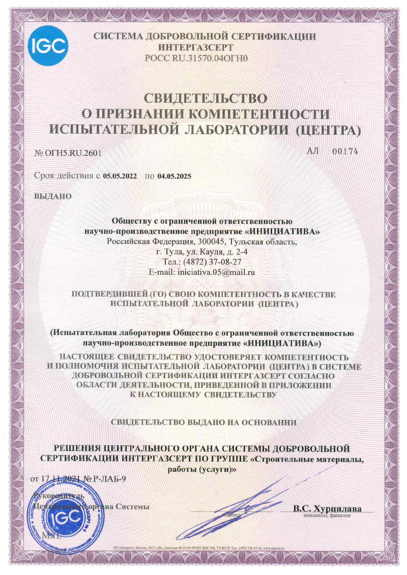 Свидетельство о признании компетентности испытательной лаборатории (центра) № ОГН5.RU.2601
