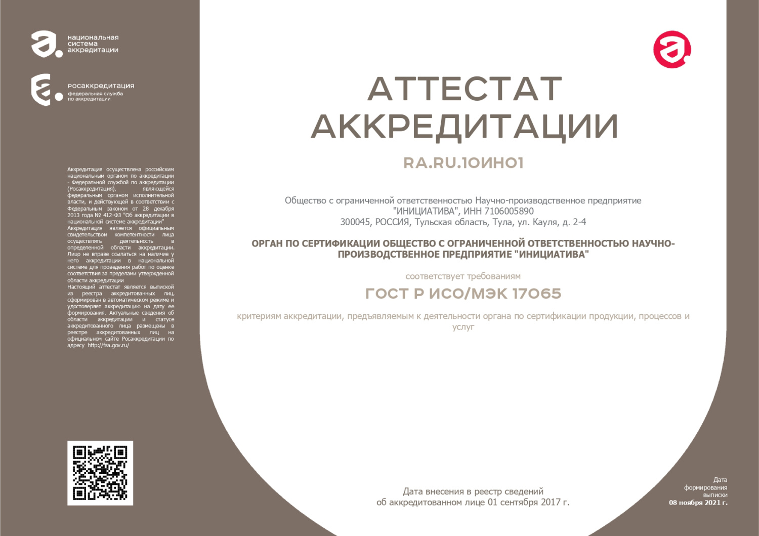 Свидетельство о признании компетентности органа по сертификации № ОГН5.RU.1301
