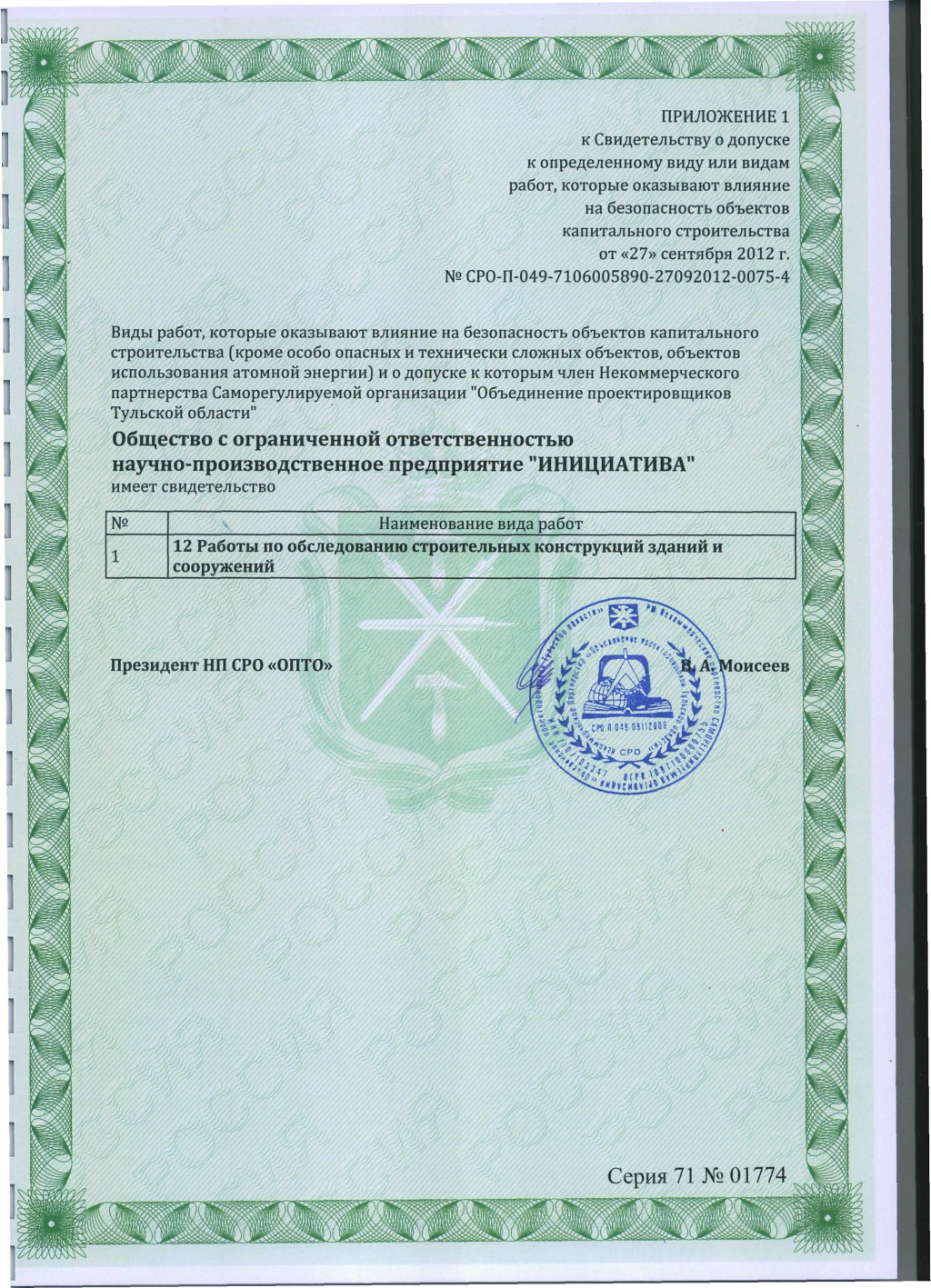Приложение 1 .Свидетельство о допуске к определенному виду или видам работ, которые оказывают влияние на безопасность объектов капитального строительства